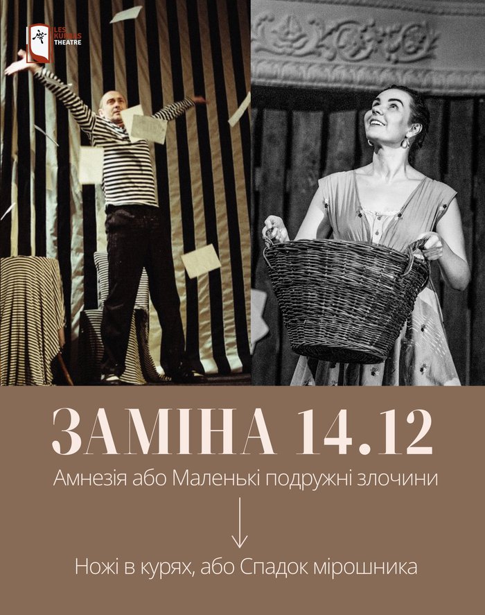 Сьогодні ввечері замість вистави «Амнезія або Маленькі подружні злочини» відбудеться показ вистави «Ножі в курях або Спадок Мірошника».
