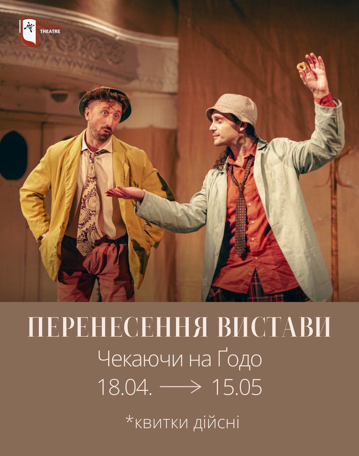 Повідомляємо, що показ вистави «Чекаючи на Годо», запланований на 18 квітня, переноситься на 15 травня - у зв’язку з хворобою актора.
